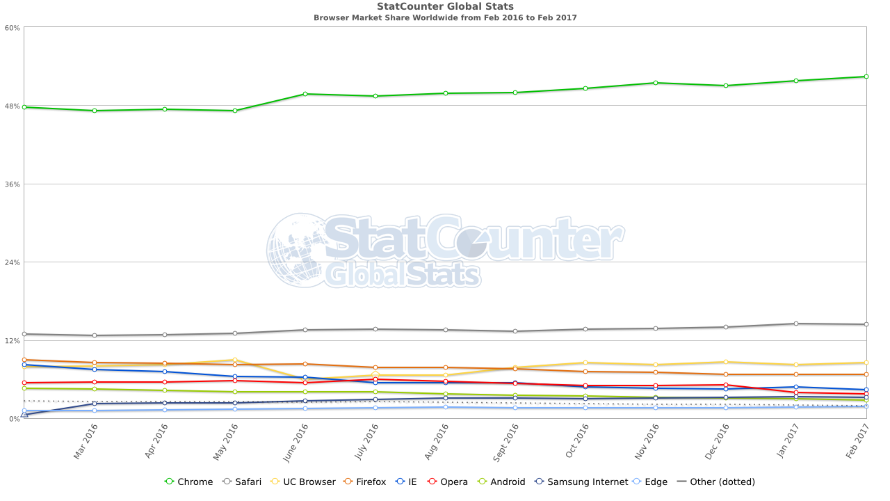 目前使用的主流浏览器有五个:Chrome、Firefox、Safari、 Internet Explorer浏览器和 Opera。本文中以开放源代码浏览器为例,即 Chrome、Firefox 浏览器和 Safari(部分开源)。根据StatCounter浏览器统计数据,目前(2017 年 3月)Chrome 、Safari 和Firefox 浏览器的总市场占有率将近 75%。由此可见,如今开放源代码浏览器在浏览器市场中占据了非常坚实的部分。